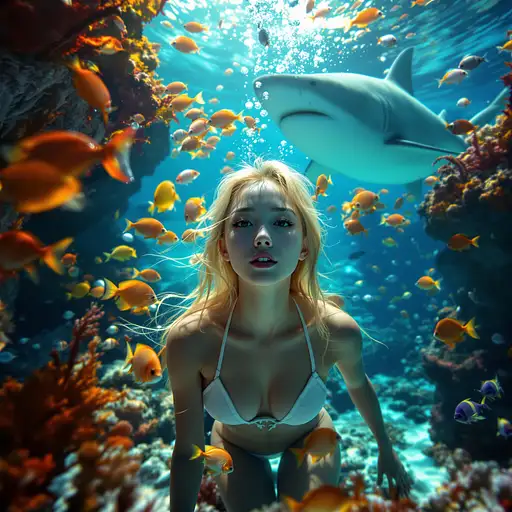 3 hours ago hyper realistic photograph of a young Asian girl with long blond hair and a bikini swimming deep underwater with school colorful tropical fish, a giant white shark in the background and lobsters on the coral sea floor. , closeup shot dreamy mood, long shafts of light, reflection bokeh, lighting on girl's face, i can't believe how beautiful this is, 8k, golden hours lighting --iw 1. 5 --chaos 30 --s 850 --v 5. 1 01f9c64afc8 PRO 0 2