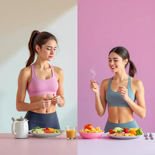 9 months ago A side-by-side comparison of a tired sports young woman skipping meals and an energetic person eating a balanced meal. Key words: educational, pastel colors, health-conscious. 0360d042027 0 29