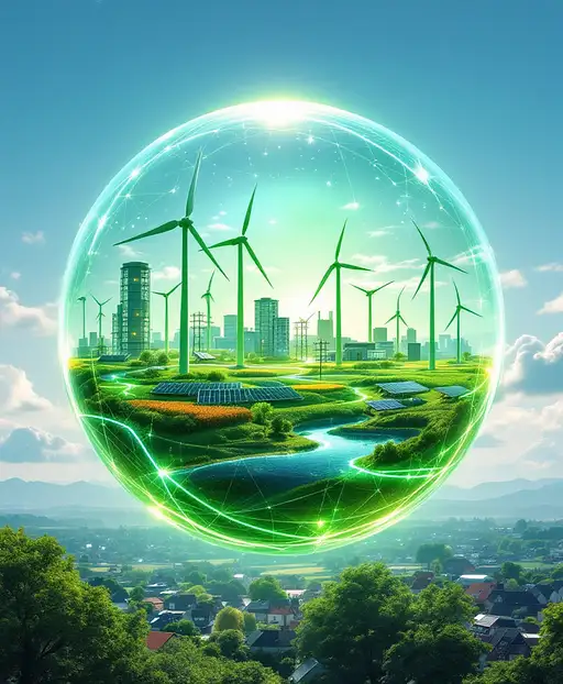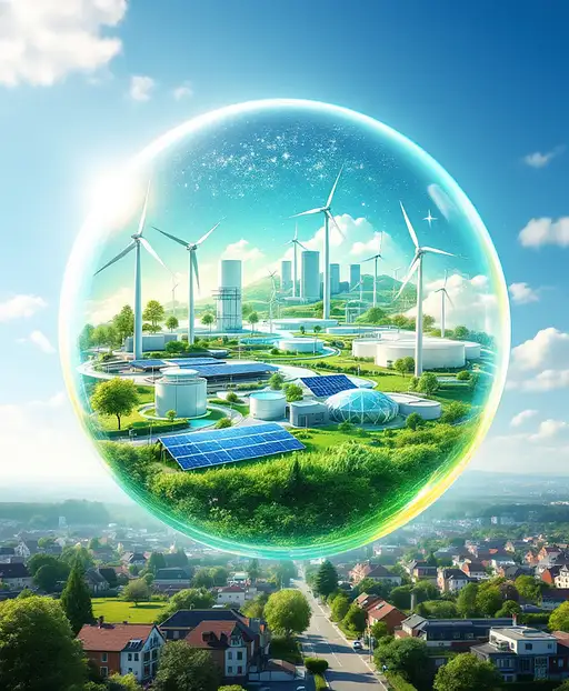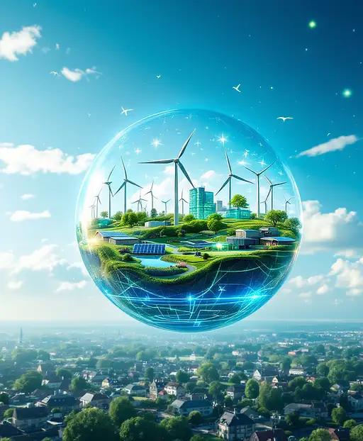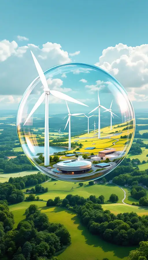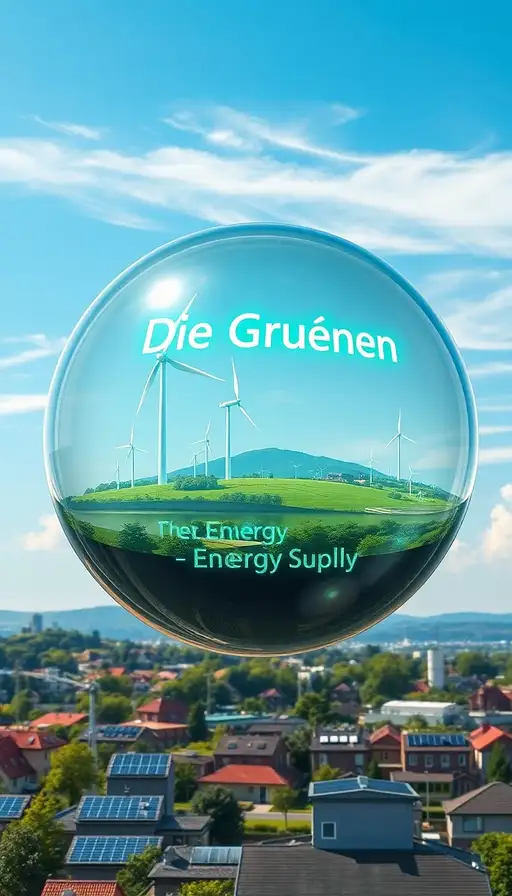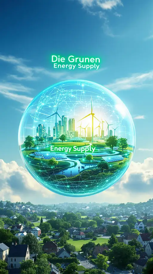 Photorealistic image of a luminous glass sphere floating in a bright blue sky with soft, wispy white clouds in the background. Inside the sphere, a dynamic scene unfolds: Modern wind turbines with sleek white blades spin gracefully alongside arrays of gleaming solar panels that catch the sunlight. A network of green hydrogen storage facilities with futuristic design elements connects to smart grid infrastructure. In the foreground, a residential area showcases houses with solar roofs and community gardens. Electric charging stations and sustainable public transport systems are visible. A subtle rainbow-like effect appears when sunlight hits the glass sphere, creating an aurora of hope. Above the sphere, the words 'Die Grünen - Energy Supply' appear as a floating, translucent hologram in a modern, eco-friendly green font that seems to be made of light particles. The entire composition should emphasize harmony between technology and nature, with a color palette dominated by blues, greens, and whites. The glass sphere should have a subtle reflection of the sky and clouds, adding depth and dimension to the image. Hyperrealistic rendering with attention to detail in the reflections and light interactions. 8K resolution, crisp details, cinematic lighting.