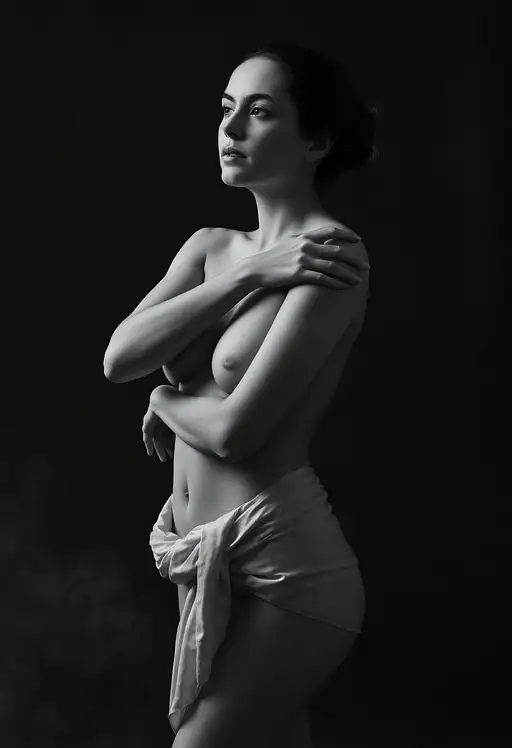 11 months ago A monochromatic, fine art portrait of a nude woman standing against a dark, smoky background, with subtle textures and depth. The lighting is soft but directional, casting delicate shadows that contour her face and torso, emphasizing the graceful curvature of her body. She gazes thoughtfully into the distance, her eyes carrying a contemplative expression, as one arm reaches across to touch her opposite shoulder, creating a gentle, protective posture. The fabric wrapped around her waist has a soft, silken texture that catches light and shadow, adding depth and elegance to the composition. Hints of haze and smoke drift in the background, contributing to a sense of mystery and atmosphere, while the image maintains a balance of intimacy and strength. This ethereal portrait evokes themes of resilience, vulnerability, and timeless beauty 0ac2d6cf50b 4 260