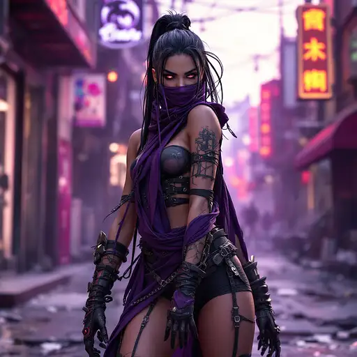 8 months ago Mortal Kombat Mileena, cyberpunk, outdoor, street, purple, hyperrealism, photorealistic, 8k, unreal engine, 3d render --ar 9:16 --niji 5 --style expressive --s 400 0b706b376ea 0 46