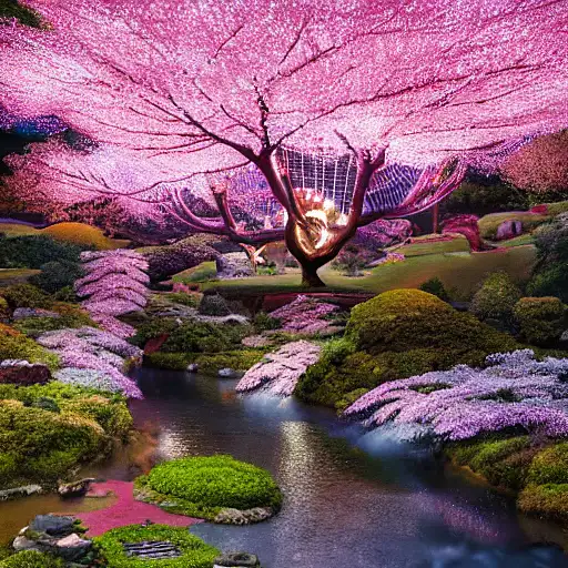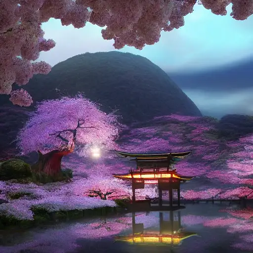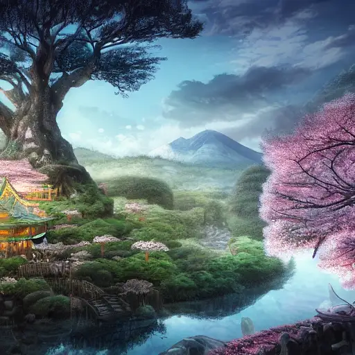 almost 3 years ago vast fantasy landscape with a giant cherry blossom tree, a suspended village is built on the tree, lots of fairy lights, high detail, japanese fantasy, rural japan, beautiful landscape, forests, mountains, waterfalls, rivers, lotr, dramatic lighting, high detail, intricate, high quality, 8k, high resolution, ultra realistic, --ar 16:9 --test 0d213660d35 1 380