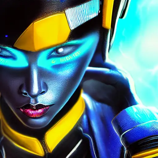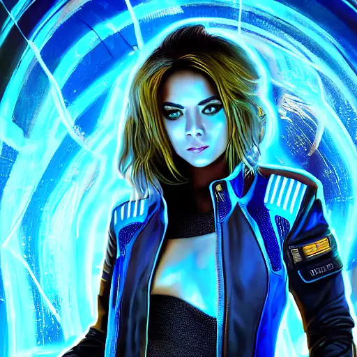 almost 3 years ago ashley benson as scifi character with blackcyberpunk jacket with glowing blue details, short blue with yellow streaks hairstyle, ultra realistic digital art, highly detailed, digital painting, artstation, concept art, smooth, sharp focus, artgerm illustration, 8k, medium distance portrait pose camera shot 0d213660d35 0 160