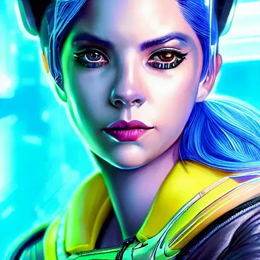 almost 3 years ago ashley benson as scifi character with blackcyberpunk jacket with glowing blue details, short blue with yellow streaks hairstyle, ultra realistic digital art, highly detailed, digital painting, artstation, concept art, smooth, sharp focus, artgerm illustration, 8k, medium distance portrait pose camera shot 0d213660d35 1 170