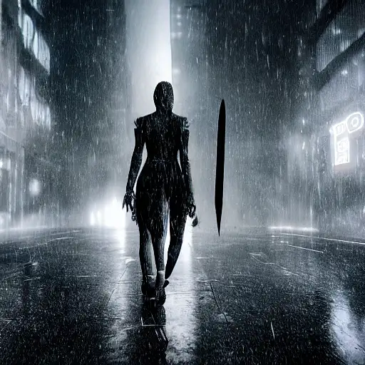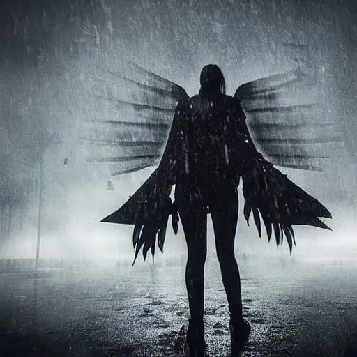 almost 3 years ago female warrior holding a sword over her shoulder walking towards the camera, giant black-feather wings, grey tones, foggy and rainy, blade runner, cyberpunk aesthetic, hyperrealistic, blurry motion 0d213660d35 0 200