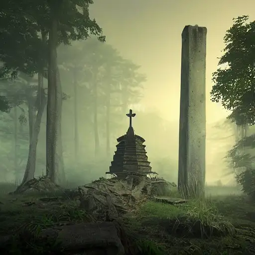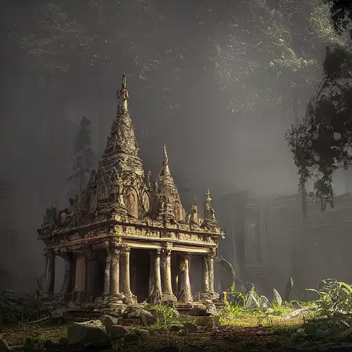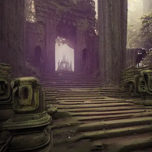 temple in ruines, forest, stairs, columns, cinematic, detailed, atmospheric, epic, concept art, Matte painting, background, mist, photo-realistic, concept art, volumetric light, cinematic epic rule of thirds octane render, 8k, corona render, movie concept art, octane render, cinematic, trending on artstation, movie concept art, cinematic composition , ultra-detailed, realistic , hyper-realistic , volumetric lighting, 8k --ar 2:3 --test --uplight