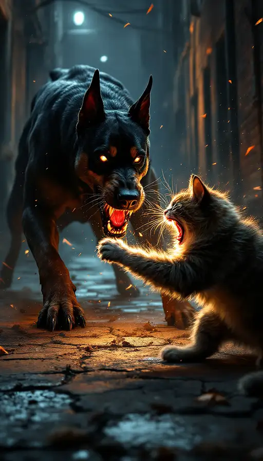 7 months ago A fierce battle between a large, aggressive dog and a wild, enraged cat. The dog, a muscular Doberman with sharp teeth bared, lunges forward with glowing eyes, while the cat, a furious Maine Coon with its fur bristling, swipes with extended claws. The scene is set in a dark alley with dramatic lighting, shadows stretching across cracked pavement. Fur and dust fly in the air, adding to the chaotic intensity. The atmosphere is tense, with a cinematic, high-contrast, and ultra-realistic art style. 0ee4480924a 1 43
