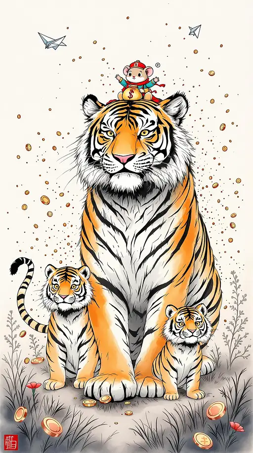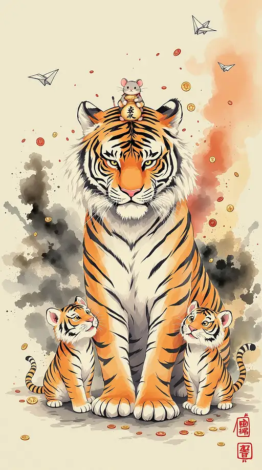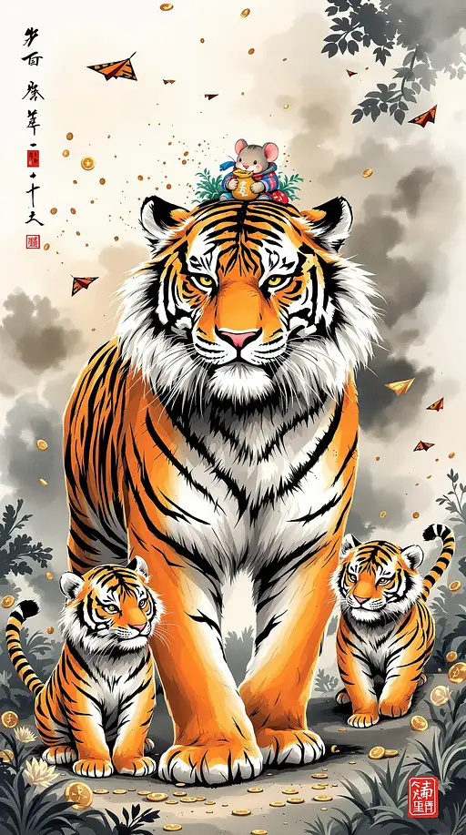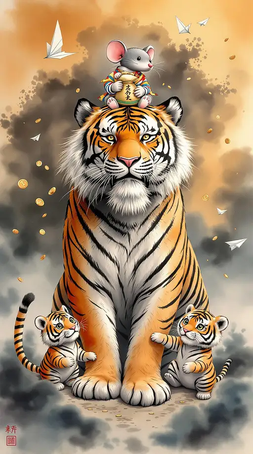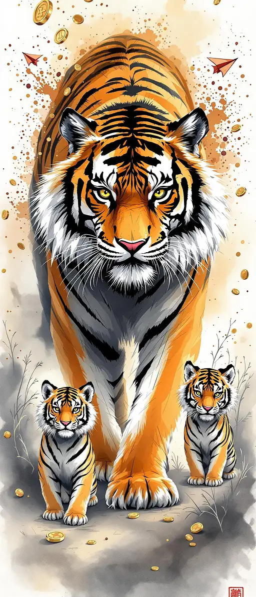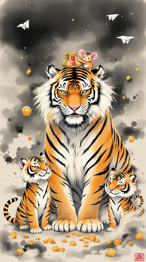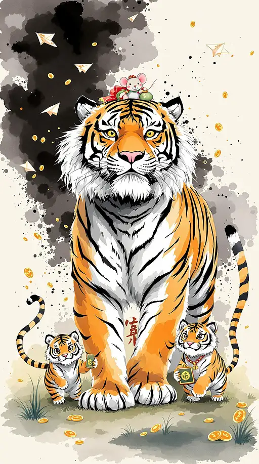 A big tiger and two little tigers, the tiger holding a money bag,In the background, a rat controls a tiger,The background is a big mouse's shadow, blending in with the background. blending with the background, in a transparent,watercolor style, featuring splashes of ink and an ink wash style, with splattered ink dots, scattered copper coins and gold beans in the background, paper airplanes in the background, ink splashes above, rich in details, the tiger is the main subject, ink swirling around its body, in an ink wash style,masterpiece, best quality, original, wallpaper, colorful, covr, everyone, gradient_background, huge_filesize, highres, traditional_media, fine_art_parody, head tilt, ink style,watercolor,masterpiece, best quality, in a meadow, walking, Stay to the right,