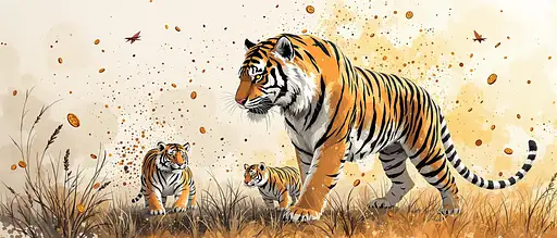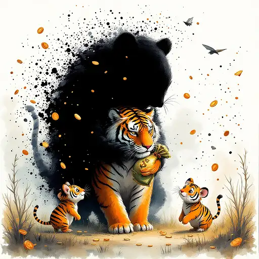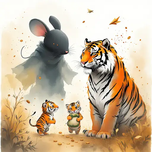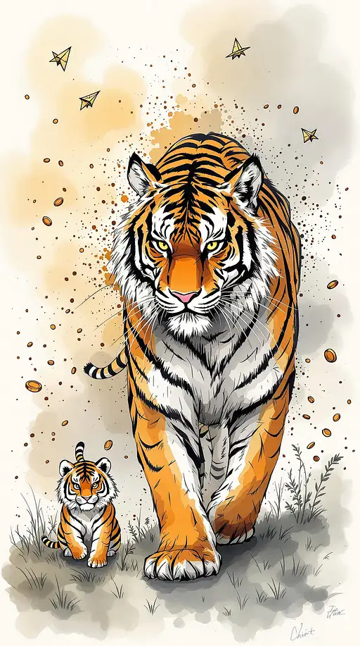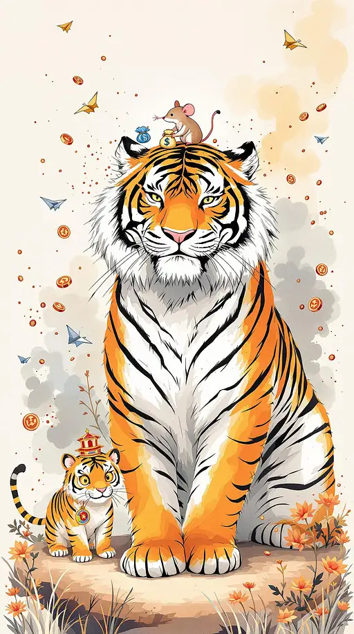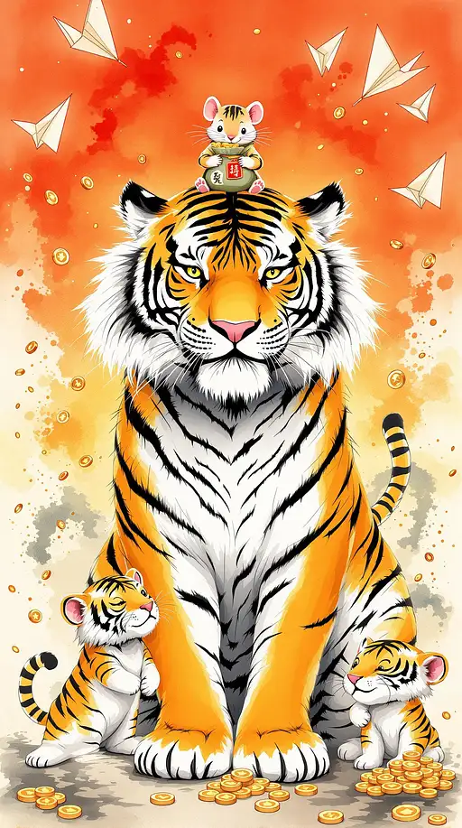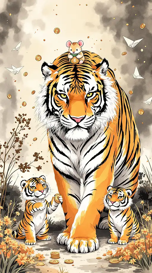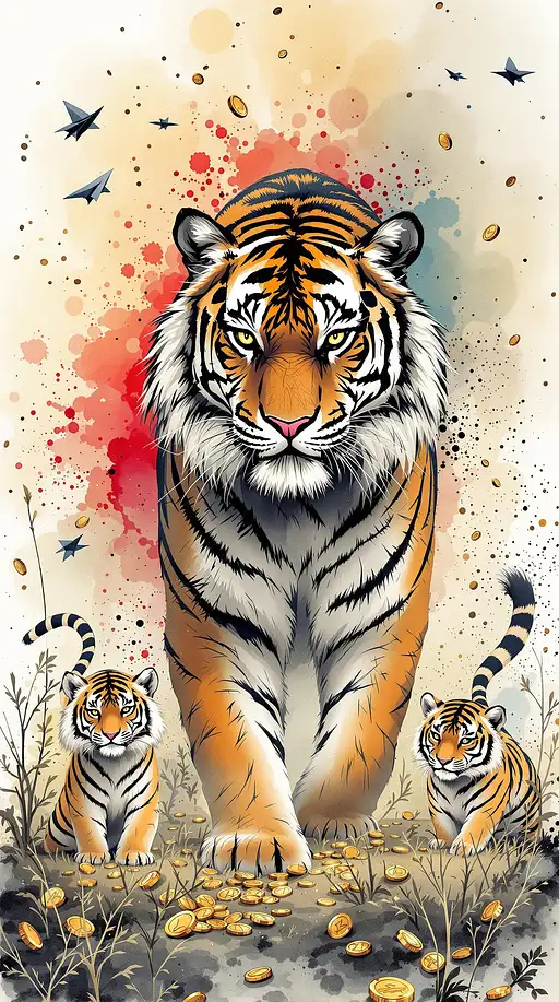 A big tiger and two little tigers, the tiger holding a money bag,In the background, a rat controls a tiger,The background is a big mouse's shadow, blending in with the background. blending with the background, in a transparent,watercolor style, featuring splashes of ink and an ink wash style, with splattered ink dots, scattered copper coins and gold beans in the background, paper airplanes in the background, ink splashes above, rich in details, the tiger is the main subject, ink swirling around its body, in an ink wash style,masterpiece, best quality, original, wallpaper, colorful, covr, everyone, gradient_background, huge_filesize, highres, traditional_media, fine_art_parody, head tilt, ink style,watercolor,masterpiece, best quality, in a meadow, walking, Stay to the right,