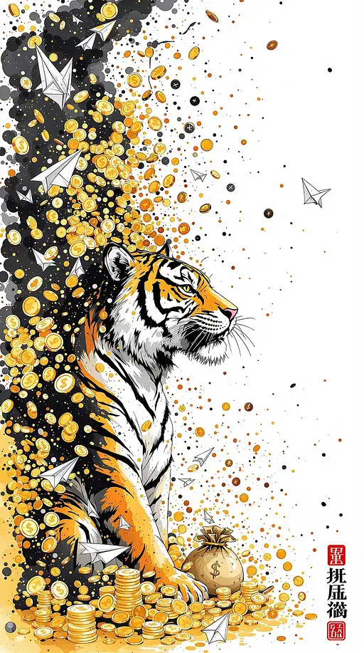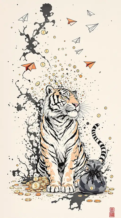 10 months ago There is gold, copper coins, peace charms, and paper airplanes floating around a tiger,Coins, A money bag overflowing., paper airplane, detailed,full-body shots,ink style,Ink splash art on the background,ink style,The whole is on the right,Ink wraps around the body, and the ink obscures the subject,Colored 157c27dd5de 0 34