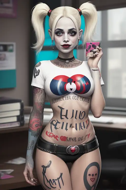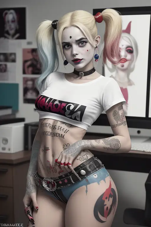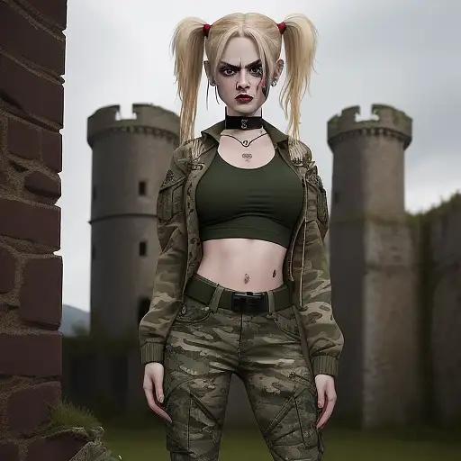 21 years old, ((camouflage military dress with tight t-shirt, open jacket and pant short)), choker)), (harley quinn style, blond with (red and green adult pigtails , stage makeup, creepy, anger, cell, skinny, slim, head wound, no tattoos, natural breasts size5, (full body visible), (on a castle ruins with dense smoke), looking at viewer, photography, detailed skin, realistic, photorealistic, 8k, highly detailed, full frame, raw color art with high detail, perforation, soft diffuse lighting