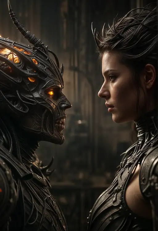 The Demonic Shield Maiden: A fierce and resilient warrior with short, vibrant red hair styled in a practical, almost barbaric way, often adorned with demonic horns, bone jewelry, and tribal markings, and her expression is both fierce and resolute. Her eyes are piercing, a fiery red that seems to burn with both rage and demonic power. She wears practical leather armor reinforced with metal and demonic sigils, with bone and demonic charms, and she carries a heavy shield with her clan's emblem and a demonic skull, and her very presence inspires fear and power. She stands on a battlefield, surrounded by demons and the echoes of battle, where the lighting is chaotic and intense, with hellfire and smoke creating a terrifying atmosphere. Her expression is determined and unwavering, with a deep connection to both her people and the demonic powers that she wields. She defends her people with her strength and her infernal power and channels demonic energy through her shield and her body. Her design is a powerful blend of demonic and Norse mythology with a touch of comic book action.