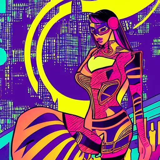 3 years ago high contrast comic book style art, cyberpunk aztec girl with the moon in the background, pop art, comic art, clean lines, bright colors --v 4 23c1d769412 1 120
