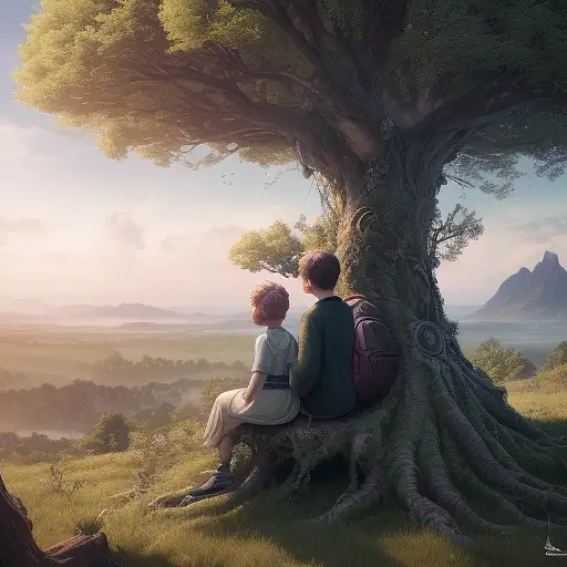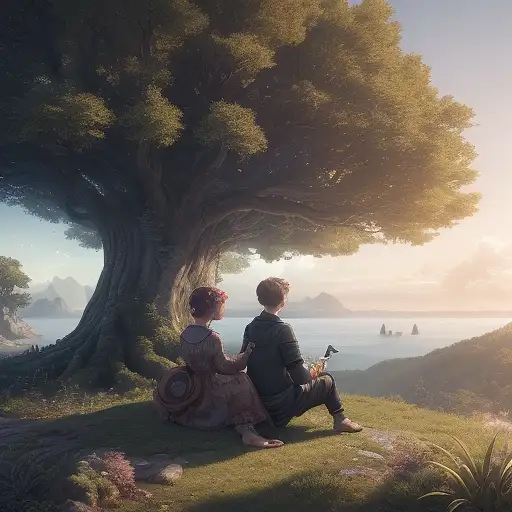 over 1 year ago Boy and girl looking at the horizon sitting on the epic tree in the background. Colorful, Detailed, 4k, Ultra Hd, Realistic, Vivid Colors, Highly Detailed, UHD Drawing, Pen And Ink, Perfect Composition, Beautiful Detailed Intricate Insanely Detailed Octane Render Trending On Artstation, 8k Artistic Photography, Photorealistic Concept Art, Soft Natural Volumetric Cinematic Perfect Light, lake blue crystal, mounteins tiny, clouds bright, tree green. Day. sun brigth. 2664a6a87a8 0 60