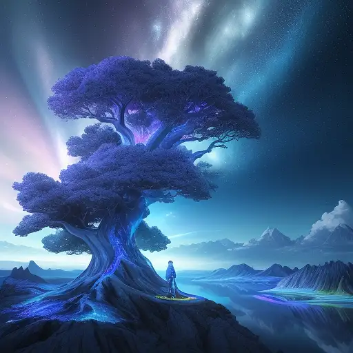 over 1 year ago Boy looking at the horizon sitting on the epic tree in the background. Beautiful prismatic-plasma lake blue crystal, mounteins epic, digital painting, extreme detail, 4k, ultra hd, hyper detailed, colorful, sparkle covered sky, masterpiece 3D science fiction art. Bright blue skys, clouds brigth white. sun white brigth. day. 2664a6a87a8 0 48