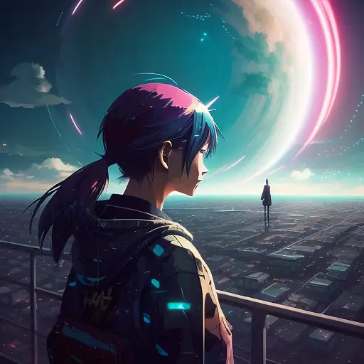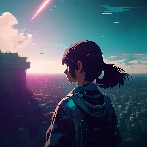 over 1 year ago Girl looking towards the horizon, photorealistic dramatic anime, omnidimensional, polychromatic colors, abstract art, fisheye lens effect, magazine, OpenGL shaders, LED, collage, art by ismail inceoglu, Your Name anime art style 2664a6a87a8 1 79