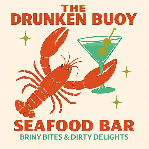 4 months ago A retro-style digital illustration for a fictional seafood bar named “The Drunken Buoy.” The central image features a bright red lobster playfully holding a martini glass filled with a green cocktail and garnished with olives. The lobster appears lively and animated. Above the lobster, bold red vintage-style text reads “THE DRUNKEN BUOY,” while below it says “SEAFOOD BAR” in a similar bold red font. At the bottom of the image, a cheeky slogan in green text reads “Briny Bites & Dirty Delights.” The background is a soft off-white with subtle distressed textures and scattered green sparkles, adding to the playful, nostalgic beachside bar vibe. Sized 1024x1024 pixels. 28dc2d3a837 0 29