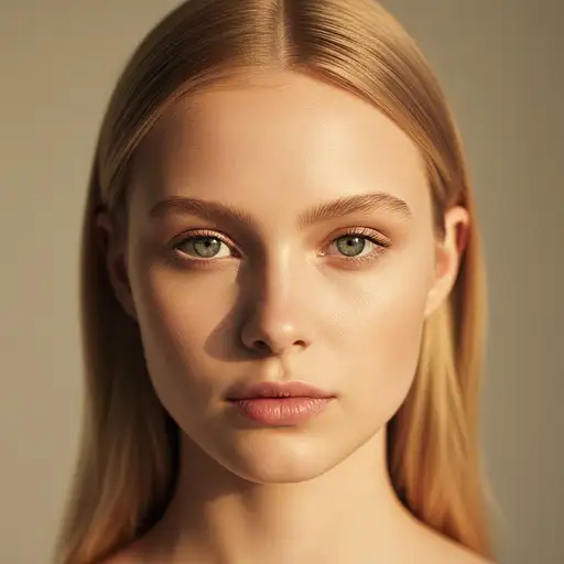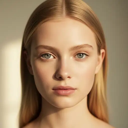 Hair soaked and darker, soft strands sticking gently to cheeks and neck, shimmering where the light hits.