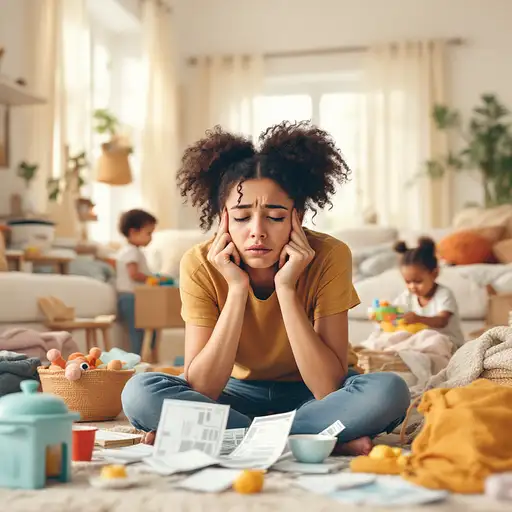 7 months ago Create an image of a tired and overwhelmed mom in a cluttered living room. She is surrounded by messy toys and unpaid bills scattered around. Her expression is sad and exhausted, reflecting the struggles of balancing children, household duties, and financial stress. The room should look disorganized, with visible signs of chaos such as dishes on the counter, toys on the floor, and clothes strewn about. The children should be depicted as playing and creating more mess in the background, highlighting the stress of motherhood and daily life. The overall color scheme should be in soft beige tones, with some muted accents, reflecting a calm yet overwhelmed atmosphere. 3178f45dbc1 0 33