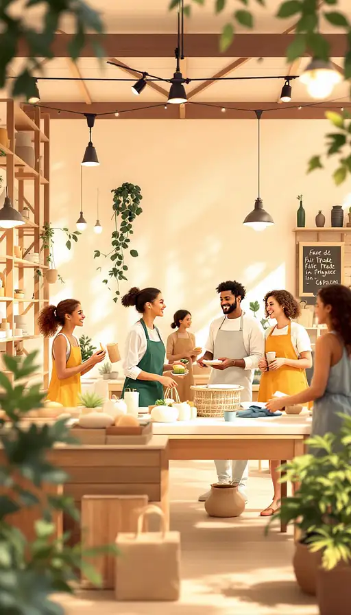 7 months ago A bright, airy scene in soft beige and cream tones, depicting a cooperative marketplace where people are engaging in fair trade and ethical shopping. The setting is a beautifully designed indoor space with natural wooden elements, warm lighting, and an inviting atmosphere. Vendors are showcasing artisanal products such as handmade crafts, organic produce, and sustainable goods. The people in the scene are diverse, smiling, and collaborating—some are discussing purchases, others are exchanging goods, and a few are working together at a community table. The ambiance conveys harmony, trust, and shared economic values. The style is modern and minimalist, with a touch of rustic elegance. 3178f45dbc1 0 19