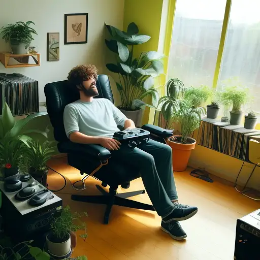 over 1 year ago A guy chilling in a sunny room with plants in. He is listening to a record player which is playing some funky music and spinning around in his chair. 33f192b016a 0 57