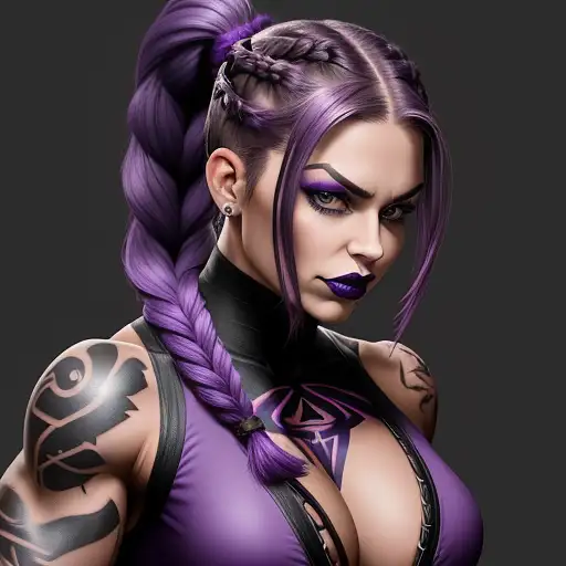 over 1 year ago muscular woman, tattoos, purple braided hair, ponytail hair, superhero outfit, cleavage, black lipstick 359838d3114 1 77