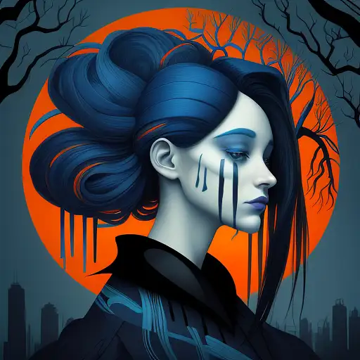 almost 2 years ago a colorful digital artwork of a woman's head and branches, in the style of haunting houses, graceful surrealism, depictions of urban life, dark sky-blue and orange, portraitures with hidden meanings, caricature-like illustrations, metropolis meets nature --ar 69:128 --s 750 --niji 5 3b8b16606ef 1 86