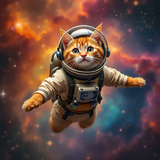 6 months ago Create a visually appealing image of a ginger tabby cat wearing a retro-style astronaut suit, complete with helmet and oxygen tank. The cat should be floating weightlessly in a vibrant, colorful nebula, with stars twinkling in the background. The style should be reminiscent of classic science fiction illustration, with a slightly whimsical and charming aesthetic. The image should be in full color, with a focus on detailed textures of the cat's fur and the astronaut suit. 40050368900 0 24