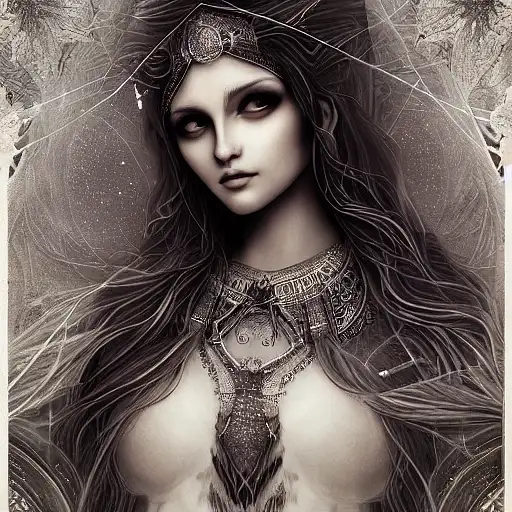 renaissance statue, the virgin whore Babalon, the number 156 glowing in the dark background, beautiful woman fighting with a lion, on her forehead a small luminated heptagram, Signed by „Astari Nin Azu“ in the lower corner in the right, theurgia, magick, perfect face, beautiful detailed eyes, sacred geometry and sacred symbols on her clothes, intricate, elegant, highly detailed in the style of god of war, digital painting, artstation, concept art, smooth, sharp focus, illustration, art by tom bagshaw, artgerm and greg rutkowski and alphonse mucha, 8,trending on artstation, by Tom Bagshaw and Seb McKinnon, full body shot, photography, epic cinematic, octane render , denoise, 360 mmNegative Prompts: out of frame, Two bodies, squinting eyes, Two heads, blurry, lowres, bad anatomy, bad hands, text, error, missing fingers, too many fingers, mutiliated body form, extra digit, fewer digits, cropped, worst wuality, low quality, normal quality, jpegartifacts, signature, watermark, username, bad feet, extra limbs, blurry,