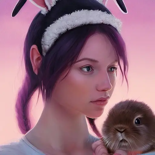 almost 3 years ago highly detailed portrait of a beautiful woman, side profile, with pink hair, pink bunny ears headband , tight clothing, fullb ody, holding a sweet baby bunny in her arms, bunny is eating pizza, stephen bliss, unreal engine, fantasy art by greg rutkowski, loish, rhads, ferdinand knab, makoto shinkai and lois van baarle, ilya kuvshinov, rossdraws, tom bagshaw, global illumination, 48ce7b37113 0 68