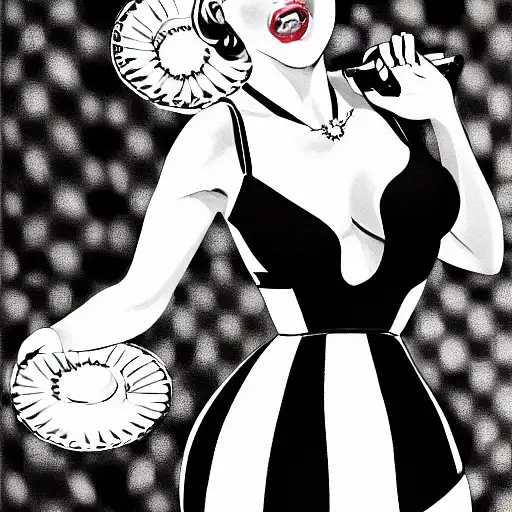 almost 3 years ago beautiful woman pinup, black and white in the style of alex ross, wearing a tight black dress, black hair ponytail, shes holding a delicious looking pie, kitchen with black and white checkered floor in the background, 2 d, 4 k, unreal, intricate, digital painting, highly detailed, artstation, sharp focus, illustration, 48ce7b37113 0 56