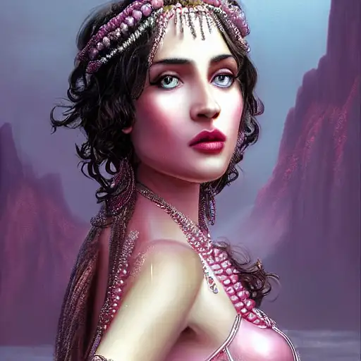 almost 3 years ago a matte painting of an insanely beautiful female goddess of seduction, sharp focus on eyes, insanely detailed pink shoulder length hair, symmetrical, wet luscious pink lips, few water droplets, beautiful pink shirt, busty, wearing a pearl necklace, intricate details, professionally retouched, elegant, 8k high definition, by artgerm and greg Rutkowski, lighting by albert Bierstadt, baby blue background with music notes 48ce7b37113 0 120