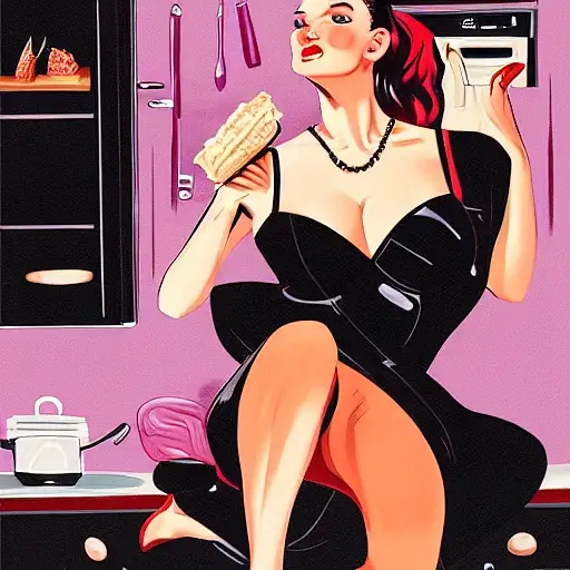 almost 3 years ago beautiful woaman pinup, in the style of alex ross, wearing a tight black dress, black hair ponytail, shes holding a delicious looking pie, kitchen with black and white checkered floor in the background, 2 d, 4 k, unreal, intricate, digital painting, highly detailed, artstation, sharp focus, illustration, 48ce7b37113 0 70
