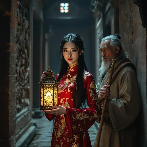 The face appears lifelike, exuding a raw intensity that grounds the surreal atmosphere of the scene. Her features are sharp yet natural, with subtle imperfections adding authenticity—a faint freckle near her cheekbone, a slight asymmetry in her soft, full lips, and the delicate sheen of moisture in her deep-set eyes. The warm light from the lantern highlights the contours of her face, accentuating her high cheekbones and the determined furrow of her brow.