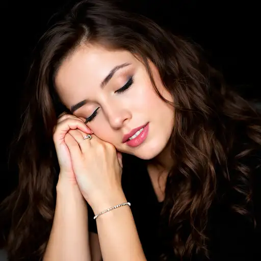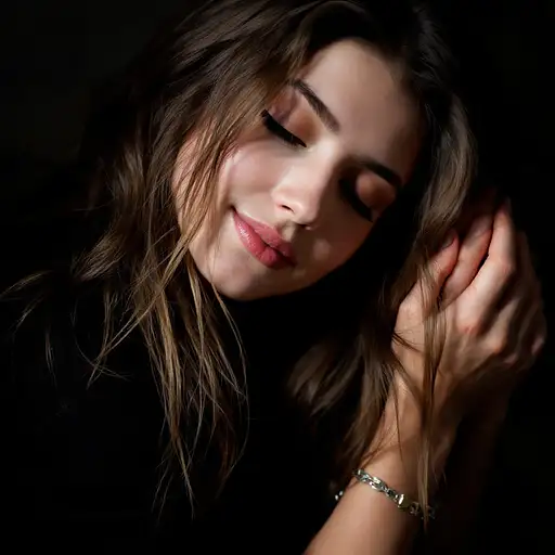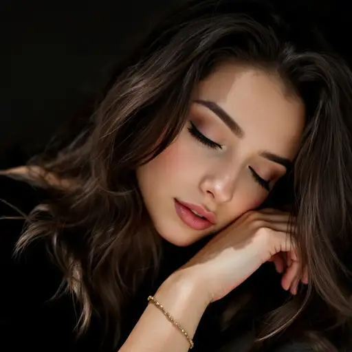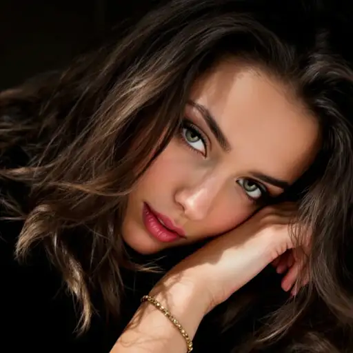 Her gaze is piercing, a mix of resolve and vulnerability, drawing the viewer in as though her story is unfolding in real-time. The natural texture of her skin is visible—fine pores and a hint of a blush on her cheeks—further enhancing the realism. Strands of her long black hair fall gently over her face, catching the light and adding dynamic movement to her otherwise still, intense expression.