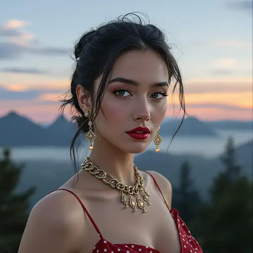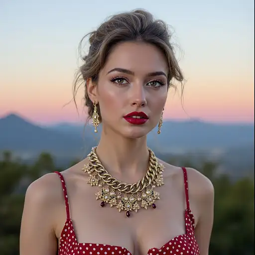This is a high-resolution photograph of a young woman with light skin and a fair complexion, captured in a natural, soft-focus style. She has a delicate, symmetrical face with high cheekbones, full lips painted in a deep red lipstick, and striking, dark brown eyes accentuated with subtle makeup. Her hair is styled in an elegant updo, with loose strands framing her face. She is wearing a bold, statement necklace made of interlocking gold chains and intricate, ornate pendants, which add a touch of vintage glamour to her look. She also has a matching pair of earrings, also featuring intricate designs.