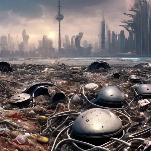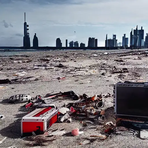 3 years ago A dystopian futuristic beach littered with detritus from technological civilization, decaying skyscrapers in the background, red ocean, metal bones, a robot dog sitting on the sand,highly-detailed ultra-realistic 8k --ar 16:9 50b69571c89 0 85