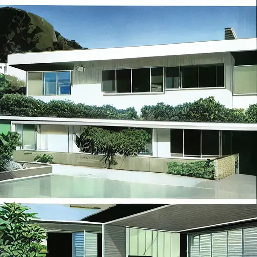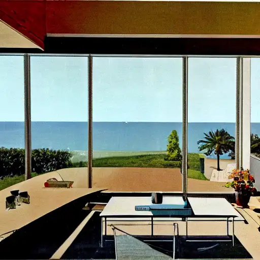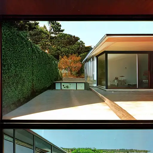 3 years ago hyper realistic eye level exterior photo of a mid century modern style house overlooking the ocean, daylight, indirect lighting, AD magazine, Frank Lloyd, Eames, Mies van der Rohe 50b69571c89 0 240