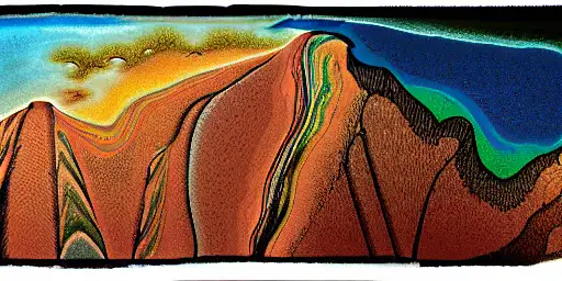 almost 3 years ago 2d chart, cross section of geological biome chart, mountain and cliff, deep valleys, colourful strata, trees errupting from rocks, swirling clouds, waterfalls, forest, pools of water, on dark paper, ink dropped in water, by peter mohrbacher, tarmo juhola, ivan laliashvili, james gurney, moebius, roger dean::color intricate full page scan :: blueprint of concept art of world map by Takashi Murakami:: sketch ink style with dark background:: ultra-detailed technical precision ::realistic composition of world map, point of interest at golden ratio, light from right, more darkness on the bottom, monumentally art composition, high quality of sketching with subtle hairlines, highly detailed rounded forms, inside out and outside in --aspect 2:1 52579c1cfb3 0 160