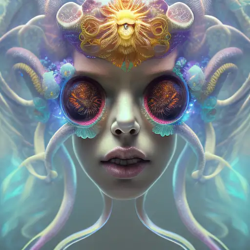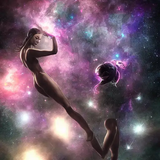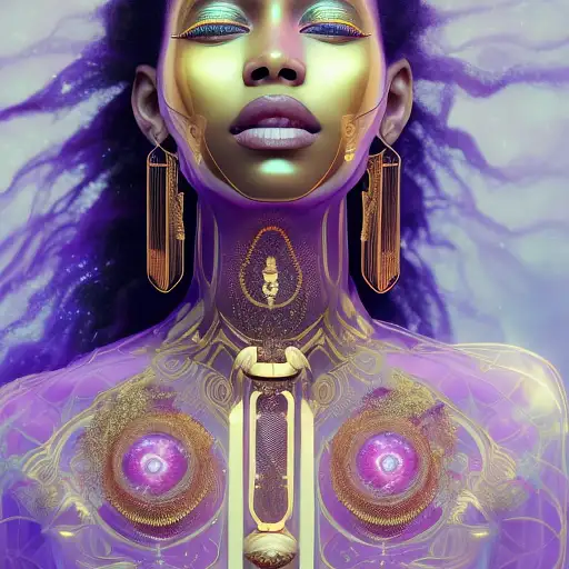 amalgamation of mercury and beautiful woman looking in mirror, emerging from gold blue pink purple ocean, glowing symmetrical eyes, mist, low angle, high definition, symmetrical face, beautiful, 3d render, unreal engine 5, real life stunning black woman with smile and eyes closed, long curly hair, flowy dress, gold earrings, ethereal, full body, vogue, magazine cover, insanely detailed and intricate, brown skin, cinematic, fashion photography, sunlight rays, rim light, shimmering, awesome, waterdrops, symmetrical composition