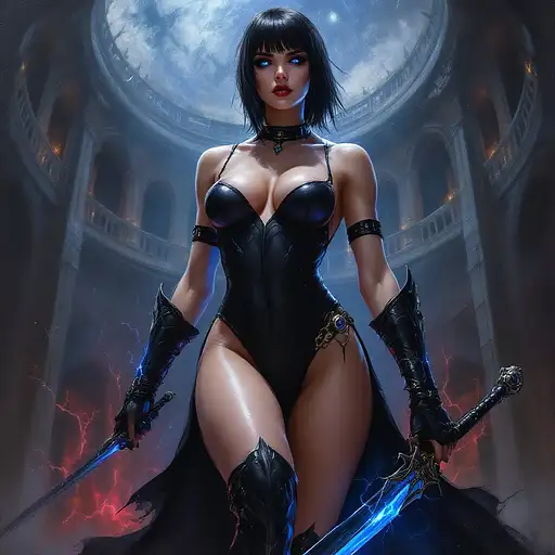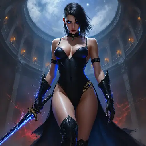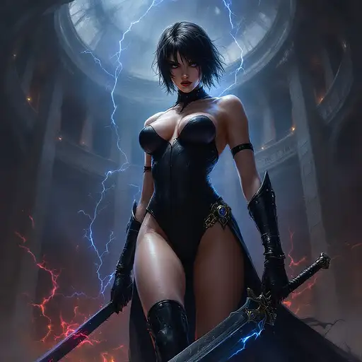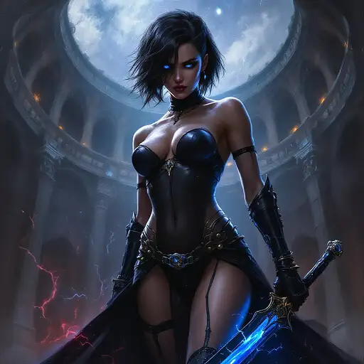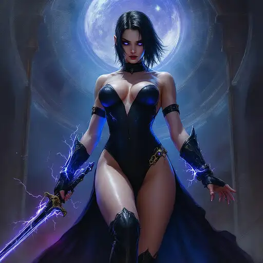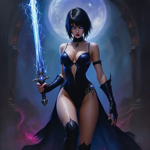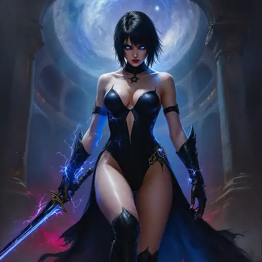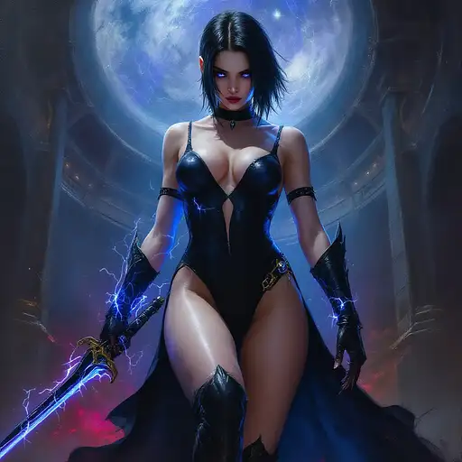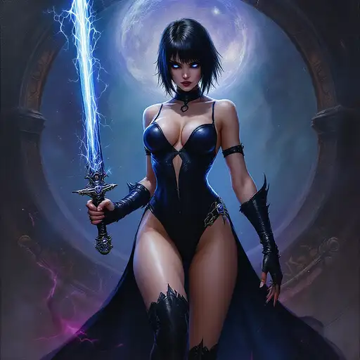 10 months ago oil painting in the style of warhammer 40k of a young female psyker, standing infront a gothic circh, holding a sabre with blue lightning, cybereyes, black ultra tight onepiece bathsuit, black sidecut hair, very big tits 55b0cffe2a5 0 2