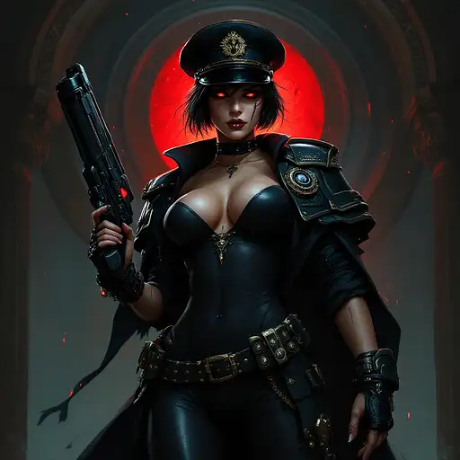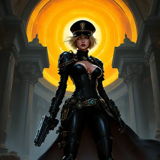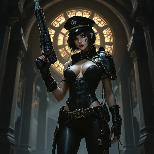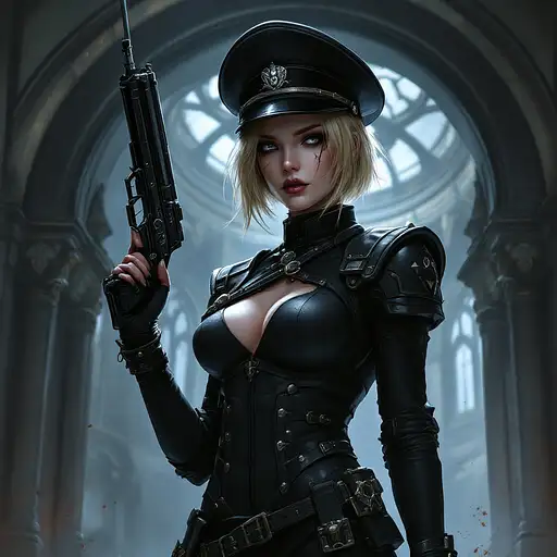 10 months ago artwork in the grimdark style of warhammer 40k of a sexy female comissar, blonde, standing infront a gothic circh, holding a sowrd and a pistol, short hair, scars, 1 cybereye, black tight uniform and officer hat, petite with small tits 55b0cffe2a5 0 14