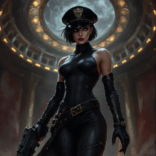 10 months ago artwork in the grimdark style of warhammer 40k of a female comissar, blonde, standing infront a gothic circh, holding a sowrd and a pistol, short hair, scars, 1 cybereye, black tight uniform and officer hat, petite with small tits 55b0cffe2a5 0 10