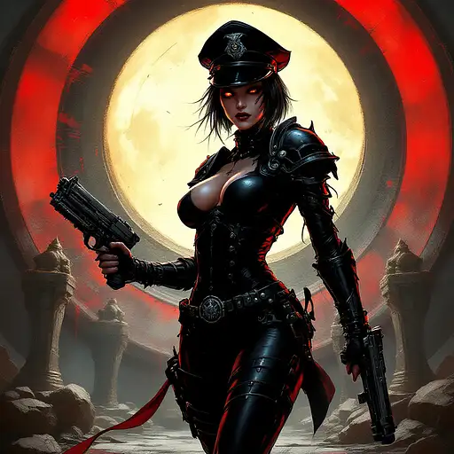 10 months ago artwork in the grimdark style of warhammer 40k of a female comissar, standing infront a gothic circh, holding a power sowrd and a plasma pistol, short hair, scars, 1 cybereye, black uniform and officer hat 55b0cffe2a5 0 30