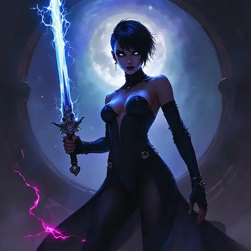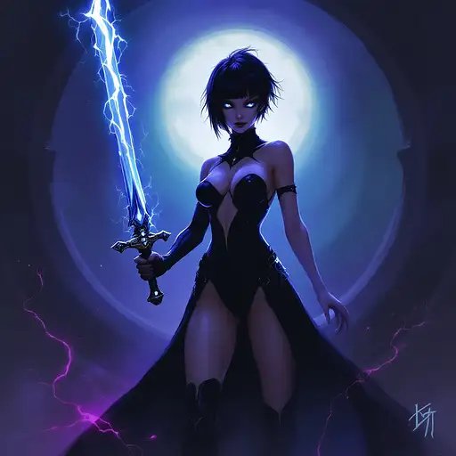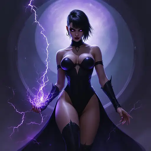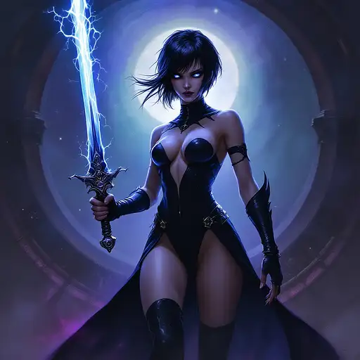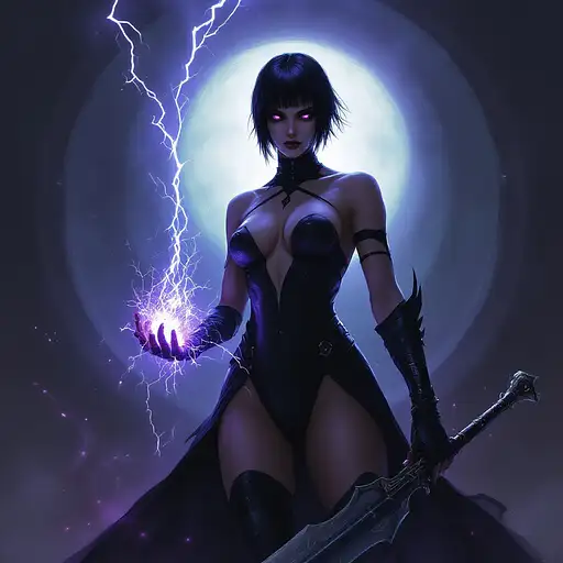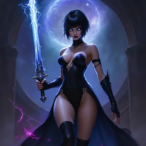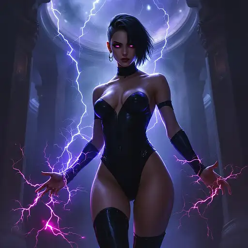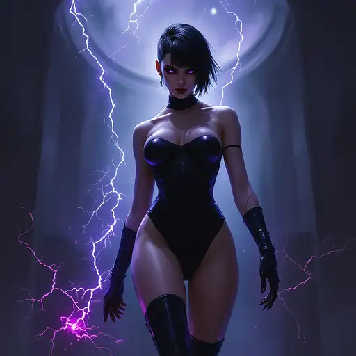 10 months ago digital minimalistic oil painting in the style of warhammer 40k of a female comissar, standing infront a gothic circh, channeling lightning magic, cybereyes, black ultra tight onepiece bathsuit, black sidecut hair, very big tits 55b0cffe2a5 0 8