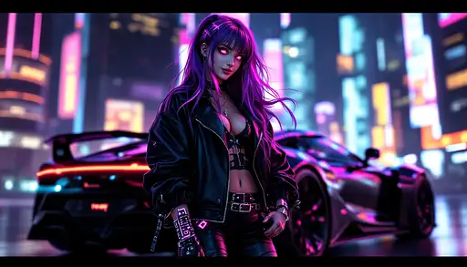 10 months ago A full-body cyberpunk girl stands confidently in front of a futuristic sports car, her black leather jacket slightly oversized, sleeves pushed up to her elbows. She has long, flowing purple hair with glowing neon streaks, and her bright pink cybernetic eyes give her an adorable yet rebellious look. She wears sleek, cyber-enhanced thigh-high boots with tiny LED lights flickering along the seams. A holographic wrist interface floats beside her, displaying encrypted messages. The neon lights from the towering skyscrapers cast a soft pink glow over her smooth, synthetic-enhanced skin. She smiles playfully, adjusting her jacket’s collar, looking like she's up to something mischievous in the neon-lit streets of a cyberpunk metropolis. 5643ce21485 0 44