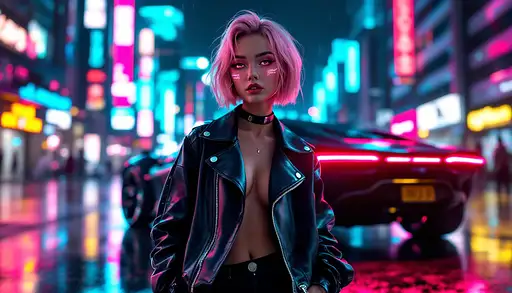 10 months ago A full-body cyberpunk girl stands confidently in front of a sleek, neon-lit futuristic car, the city lights reflecting off the rain-slicked pavement. She wears a slightly oversized black leather jacket, its metallic zippers and studs glinting under the vibrant glow of pink and blue neon signs. The jacket drapes loosely over her, adding to her effortlessly cool yet cute appearance. Her short, pastel pink bob haircut is illuminated by the neon lights, strands glowing under the futuristic cityscape. Her large, cyber-enhanced eyes shimmer with a playful, soft glow, displaying a holographic interface within their irises. She has small glowing circuit tattoos along her cheeks, adding a touch of futuristic charm. She wears thigh-high cybernetic boots with neon accents, each step causing a soft hum of energy to radiate beneath her feet. Her futuristic car behind her hums with neon underglow, its sleek black body reflecting the electric hues of the city. The air is filled with a soft drizzle, causing the neon reflections to shimmer across the wet streets. She stands with one hand tucked into her jacket pocket, the other gently adjusting her high-tech glasses, giving off an aura of adorable confidence in the heart of the cyberpunk metropolis 5643ce21485 0 23