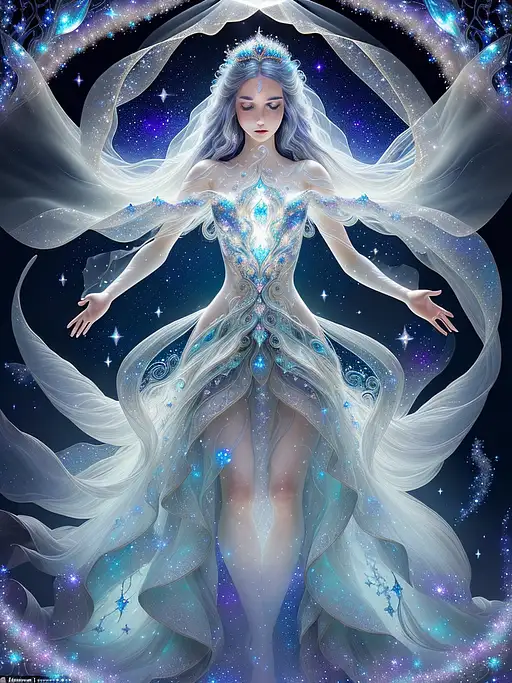 over 1 year ago A stunningly detailed full body ((double exposure)) of a ethereal princess made from (glass), with galaxy dust swirling around her and enchanted stars shining from within. The intricate craftsmanship captures every delicate feature of the princess, from her flowing hair to her graceful pose. This mesmerizing artwork is a blend of realism and fantasy, creating a truly magical and captivating image. Highly detailed, 8k sharp focus, photorealism fantasy<lora:SparkleCore:1.0> <lora:GlassCore:1.0> 572492cbd4b 0 81
