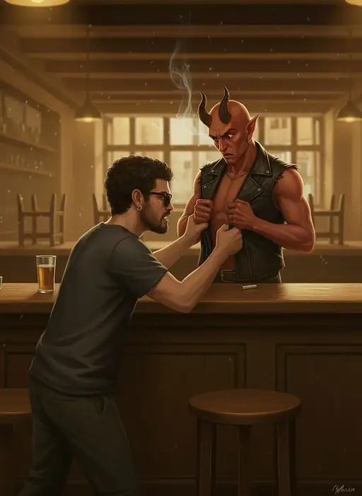 14 days ago Mantenme a los dos personajes en la misma posición pero debes cambiar el fondo. Ahora no miran hacia unas ventanas. NO MIRAN HACIA VENTANAS. MANTÉN A LOS DOS PERSONAJES EXACTAMENTE IGUAL. Miran hacia un bar. Están en la barra, detrás de la barra hay un demonio que tiene un cigarro encendido en la boca mientras sirve una cerveza. El demonio está serio. El resto del bar es jovial. Mantén la misma luz y ambiente. 597297a32d0 PRO 0 14