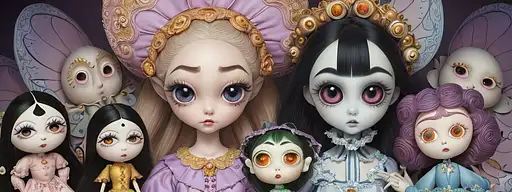 2 years ago 25 beautiful dolls ,Fairytale art by Mary Blair, Naoto Hattori, Tim Burton. Insanely detailed portrait tiny adorable cute Skin Tone Pale , Tilted Neck, Lashes , left correction, ornate costume, vibrant round big glass eyes, The facial expression is frowning, the eyes are tilted to the left, the eyebrows are stretched. Sharp and elongated eyebrows ,EsterFerrerDolls style 59c4ef58a81 0 64